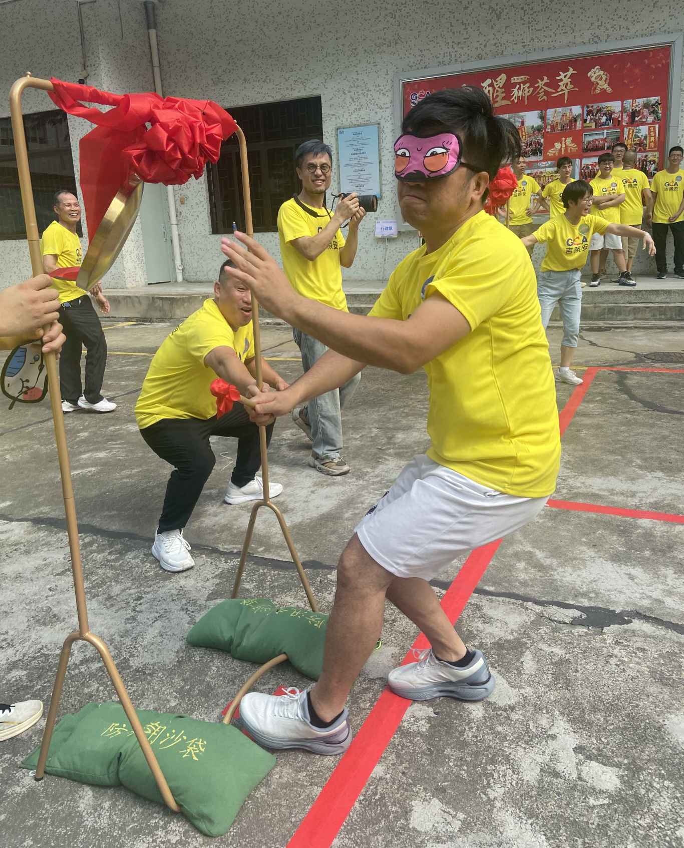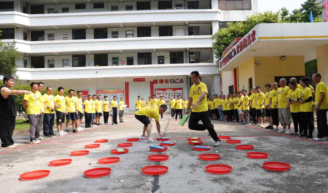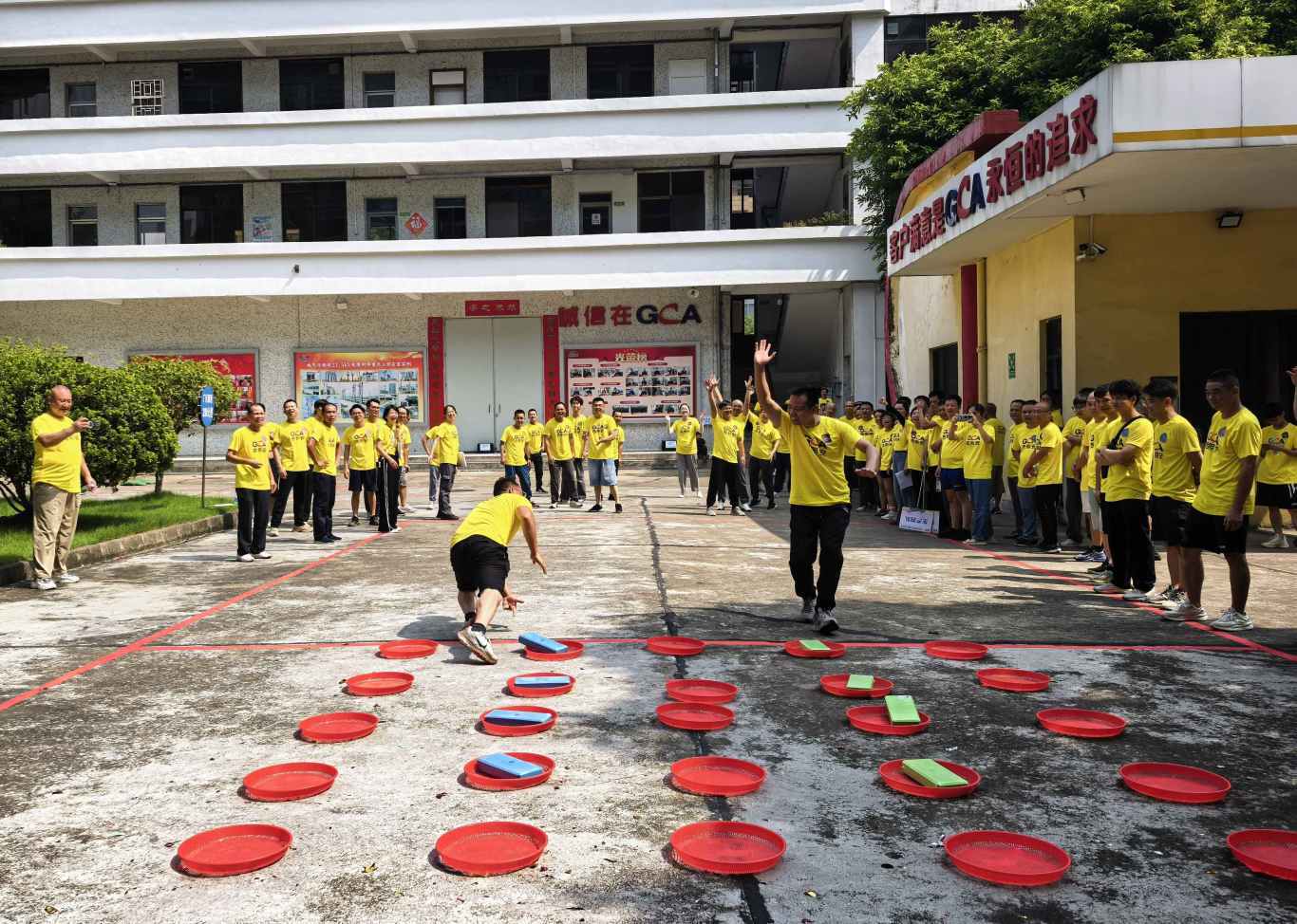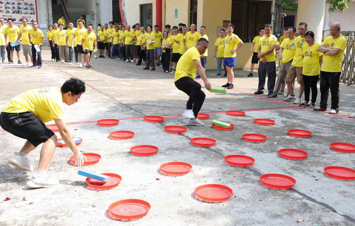 大家身着统一黄色T恤集合。活动开始,一场轻松有趣的集体暖身小游戏瞬间点燃了全场气氛,员工们在欢声笑语中活动筋骨,为后续做好准备。
